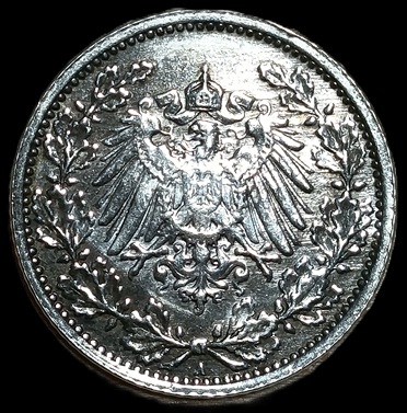 Germany. 1917. ½ Mark type 2 – small shield. A. 2.79g. Silver .900. Unc. C707. RI.4