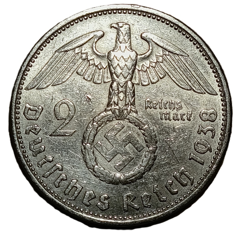 Germany. 1938. 2 Reichsmark Paul von Hindenburg. A. 7.94g. Silver .625. Au. C637. RI.4