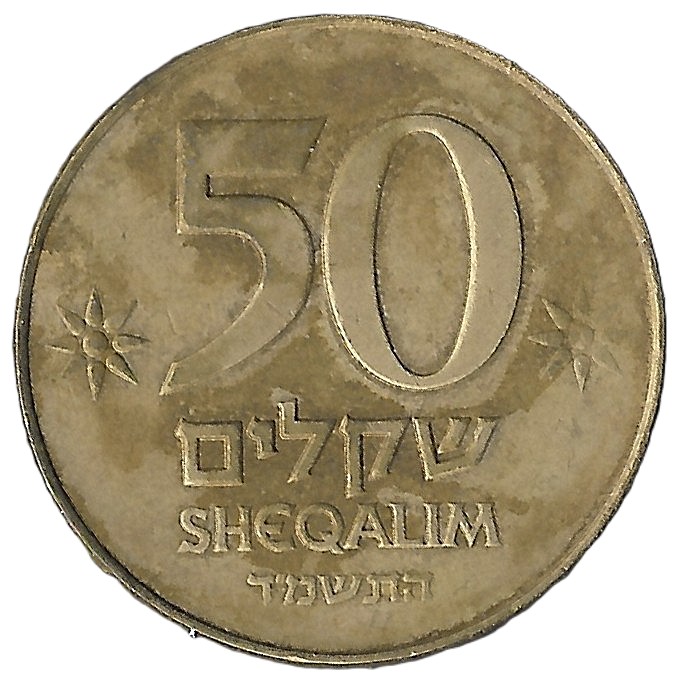 By 1984 the old sheqel had collapsed under hyperinflation. This 50-sheqalim coin was Israel’s largest circulating denomination and symbolized the currency’s last stage before reform. -
