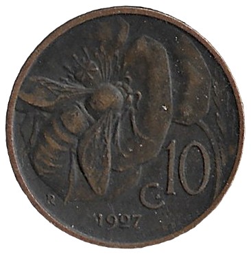 Italy. 1927. 10 Centesimi – Victor Emmanuel III. 5.42g. Copper. XF. C520. RI.3
