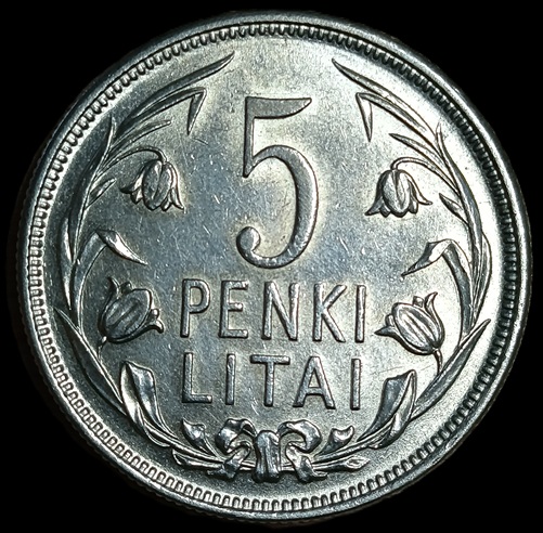 Lithuania. 1925. 5 Litai. 13.49g. Silver .500. AU. C712. RI.16