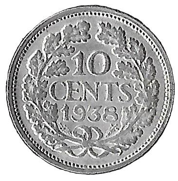 Netherlands. 1938. 10 Cents – Wilhelmina. Silver (.640). 1.40g. XF. C403. RI.5