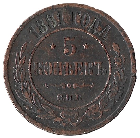 Russia. 1881. 5 Kopecks. 15.25g. Copper. VF. C600. RI.7
