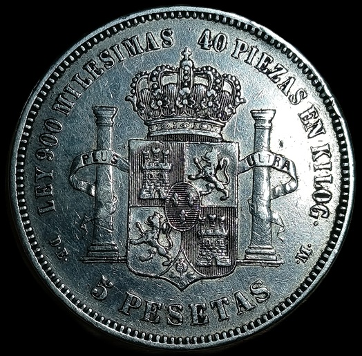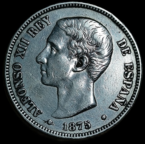 Spain. 1875. 5 Pesetas – Alfonso XII 1st portrait. 24.84g. Silver .900. AU. C711. RI.11