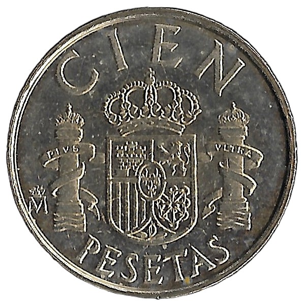 Large numeric 100 PTAS in center, crowned coat of arms of Spain above, with mint mark (M crowned) at right.